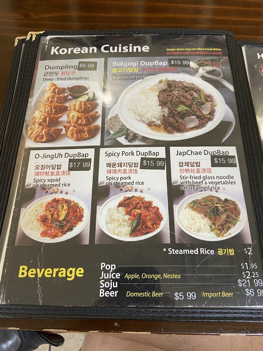 As you step inside, the scent of sizzling meats and fragrant spices wafts through the air, welcoming you to indulge in a feast for the senses. The menu is a true reflection of Korea's rich culinary heritage. Start with the crispy Dumpling at just CA$8.99, where each bite reveals a savory blend of flavors. For more substantial fare, don’t miss the delectable Bulgogi Dupbap, a marinated beef sirloin served on a bed of steamed rice for CA$15.99, or the fiery Spicy Pork Dupbap at the same price, perfect for spice enthusiasts.